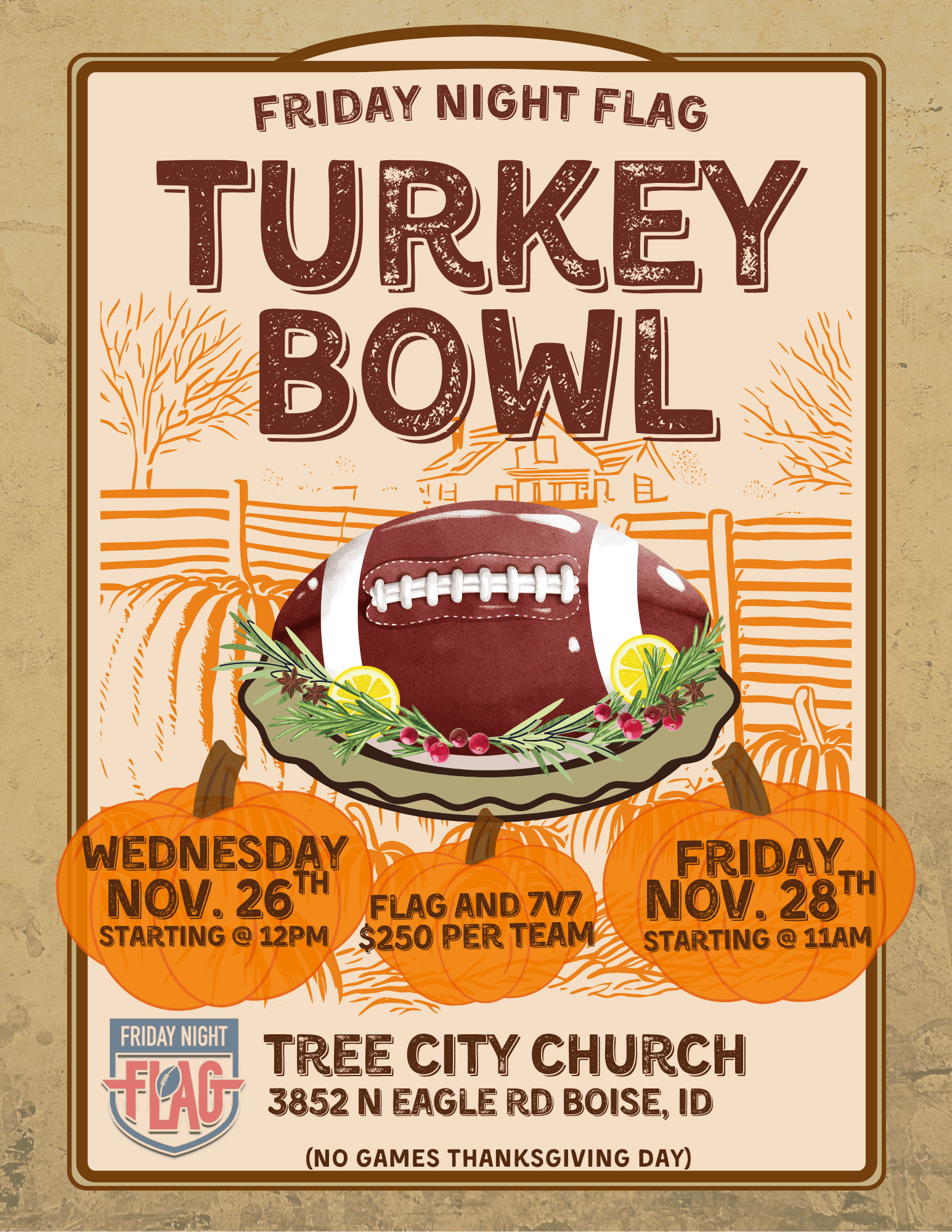 We will be hosting a Turkey Bowl Flag Football tournament Wednesday November 26th and Friday November 28th. This tourney will be a 3-game guarantee with 2 pool play games and a single elimination tourney. *Nothing on Thanksgiving Day